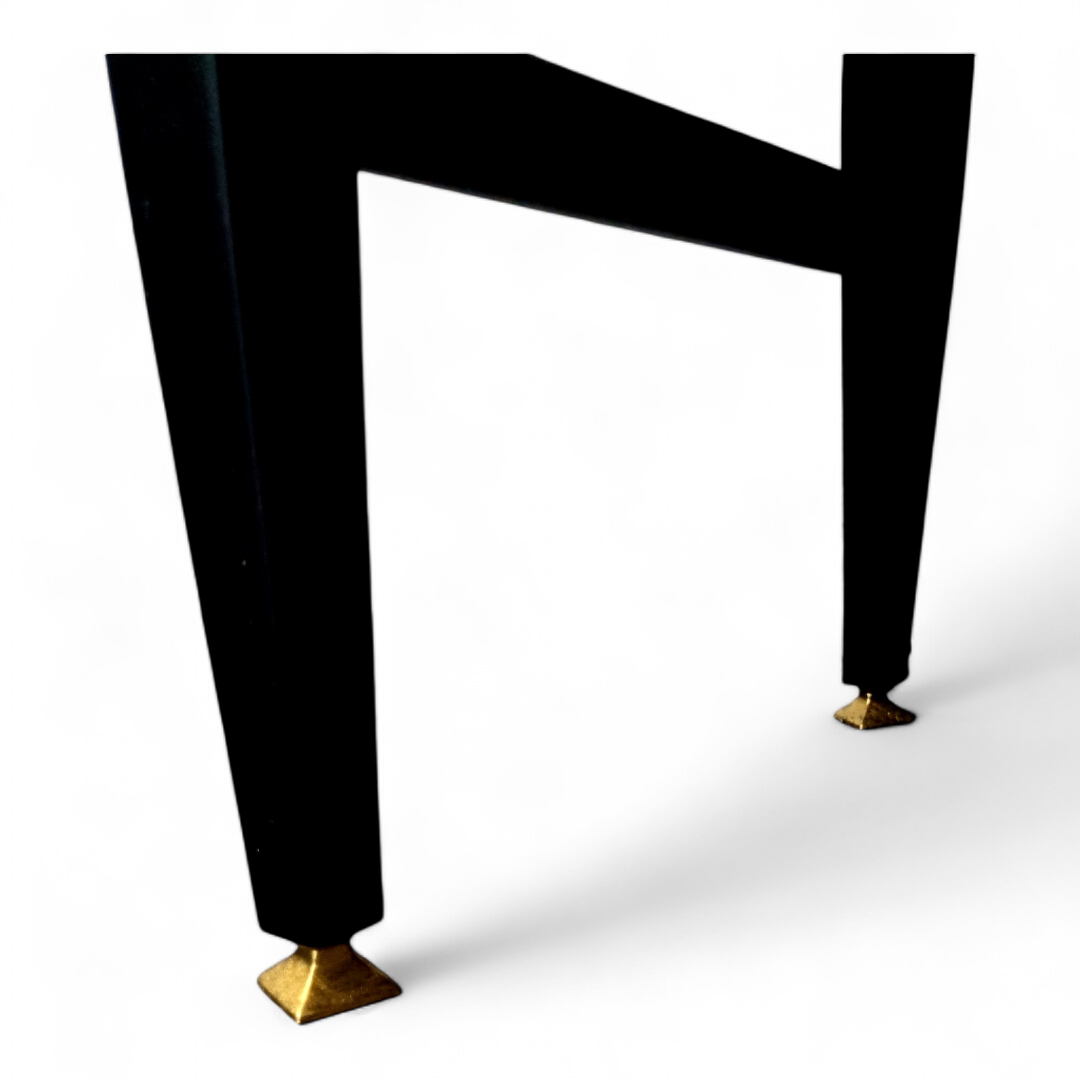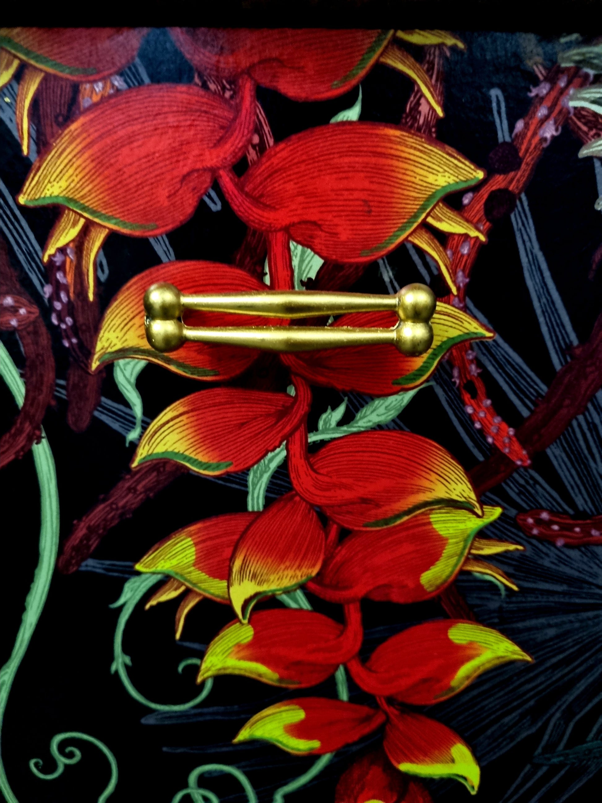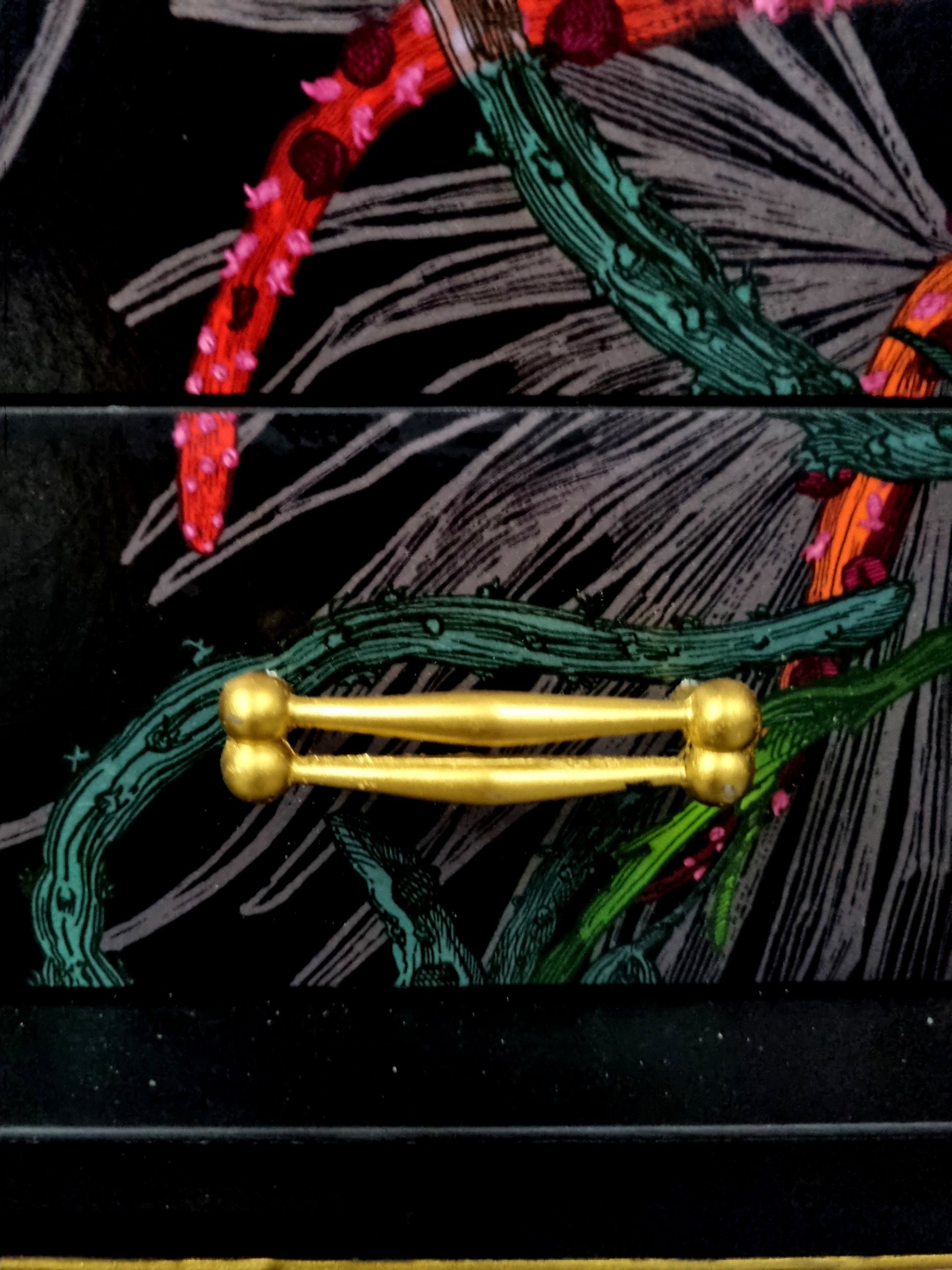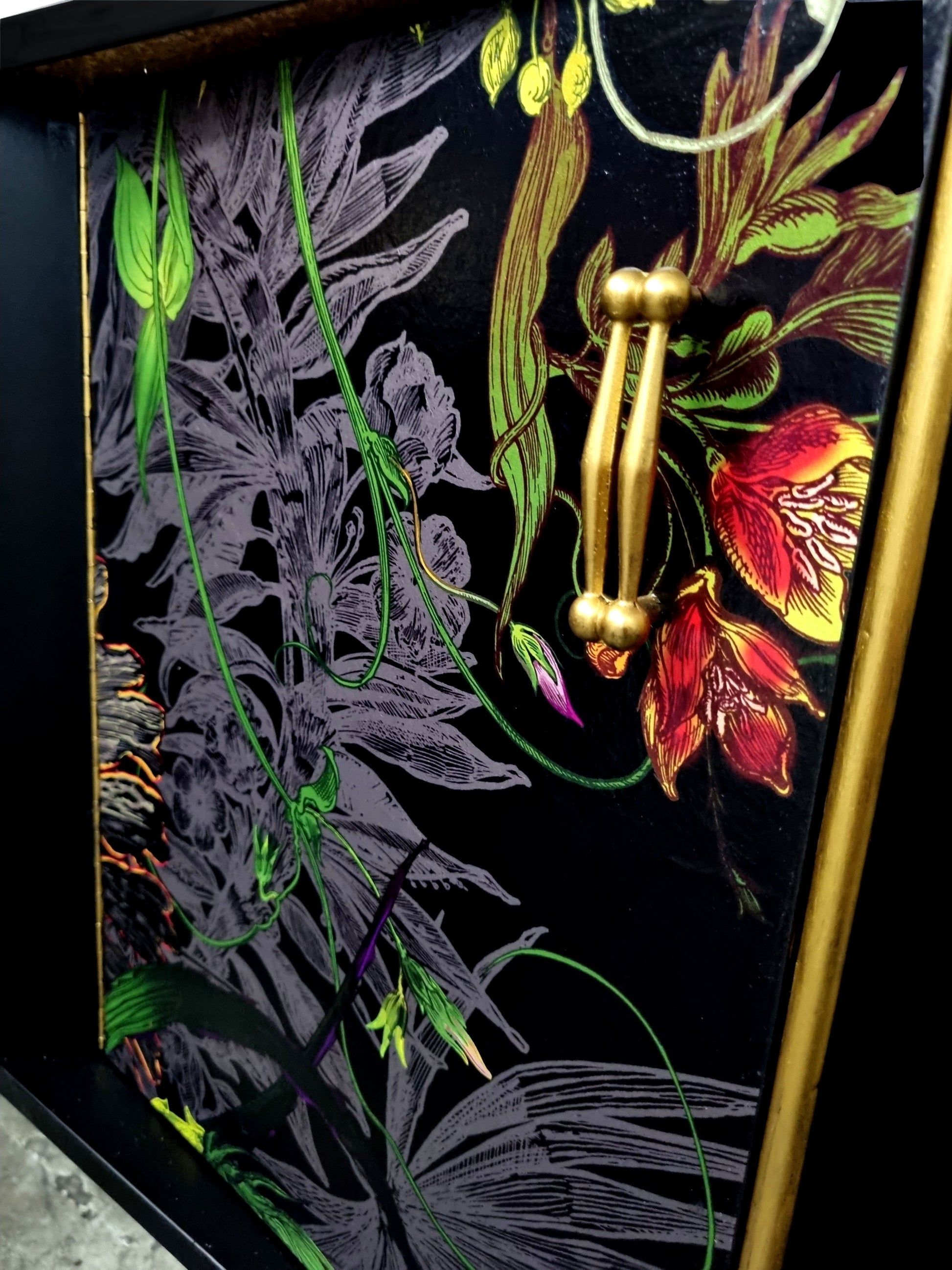 A stunning Mid Century sideboard / TV unit which has been lovingly up-cycled in my studio. It has three cupboards and a drawer lined with red snakeskin. The middle cupboard has a pull down door and a glass bottom - perfect for bottles and glasses. The sideboard has been decoupaged with Timorous Beasties Clouded Leopard paper - a scene of tropical splendour filled with exotic flora. The paper has been given layers and layers of varnish for protection. We have added glass on top for extra protection. The brass metal handles are original to the piece and we have added gold gilding. There are matching brass metal feet. Keeping your home free from the mass produced!