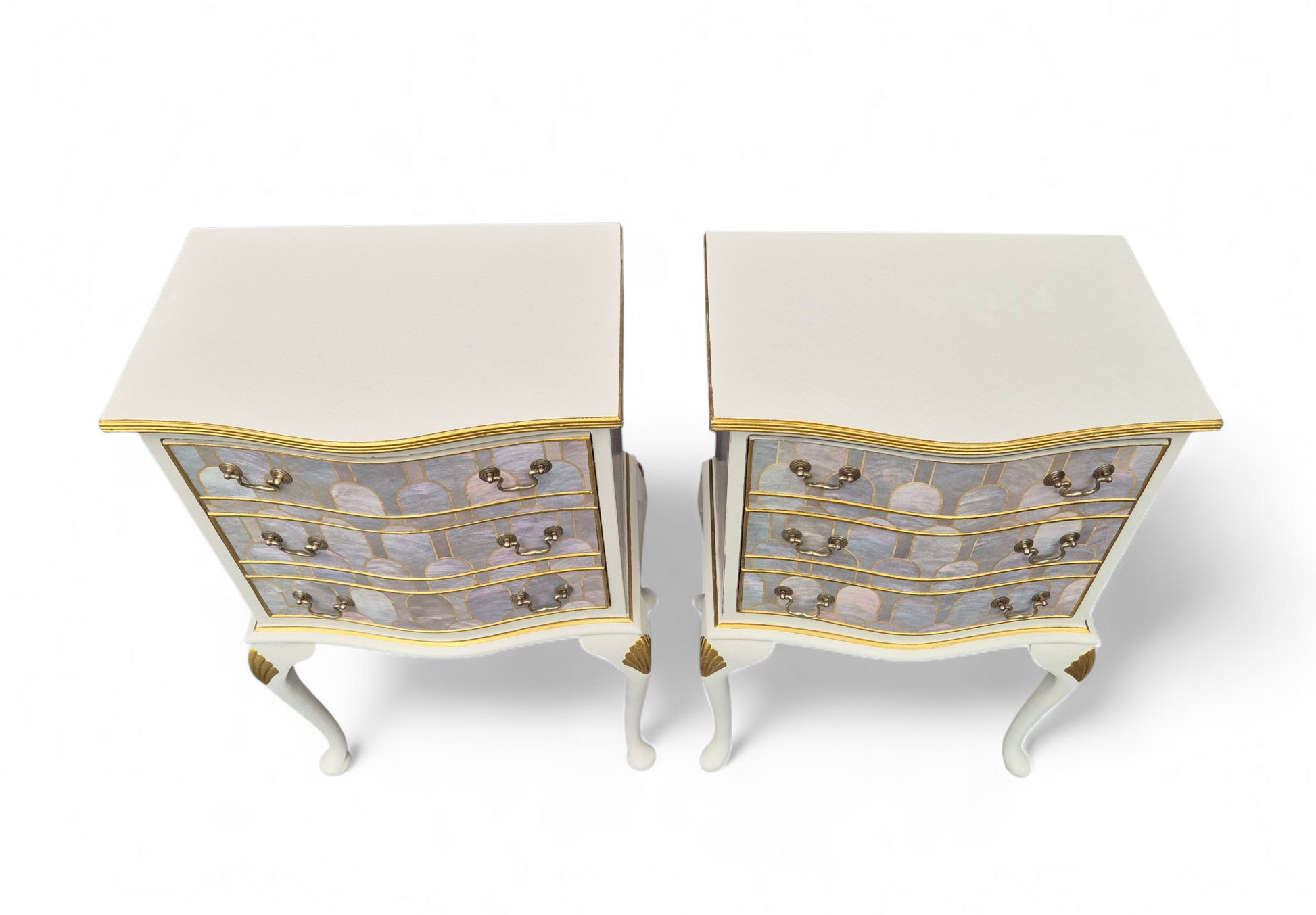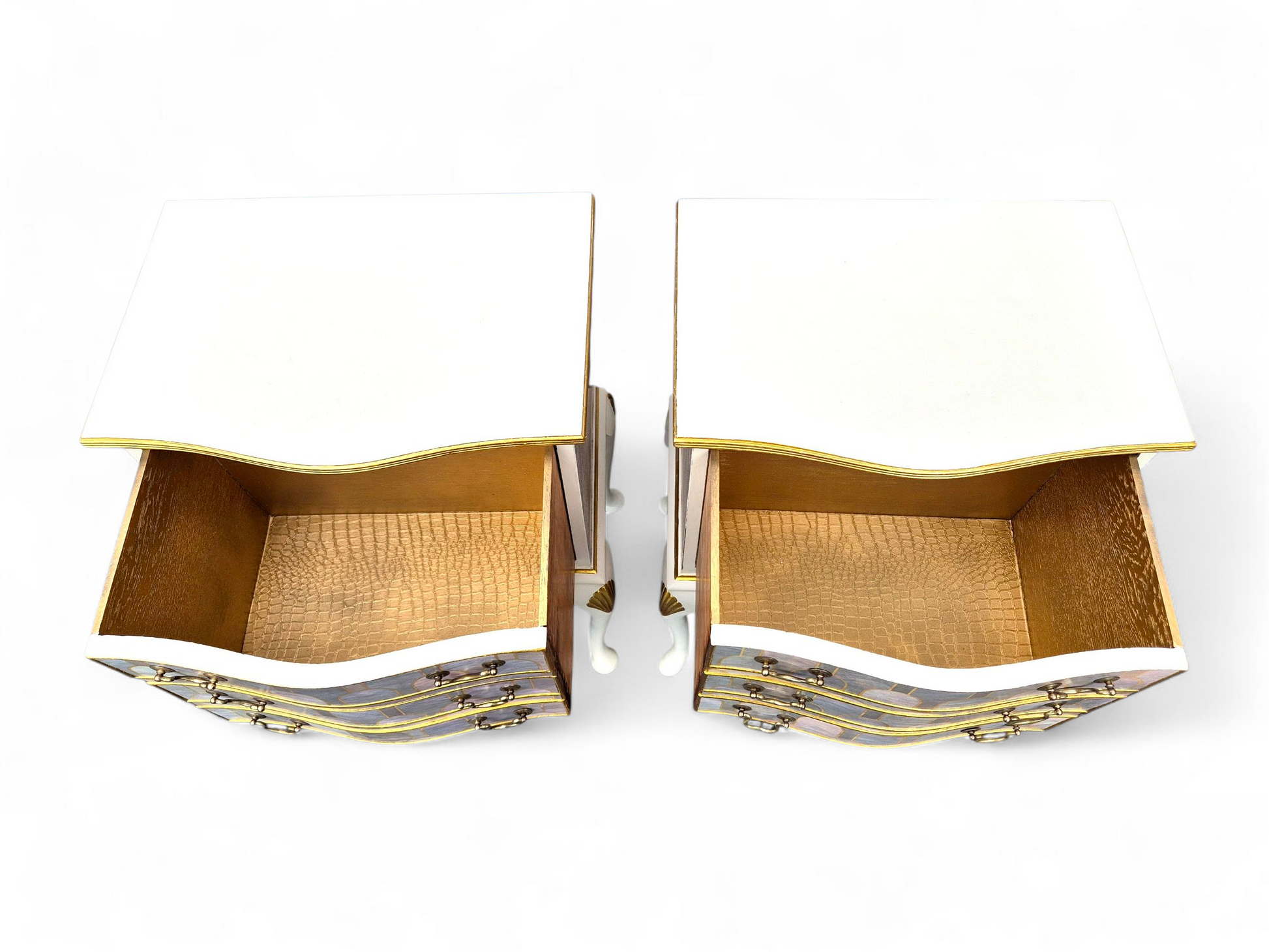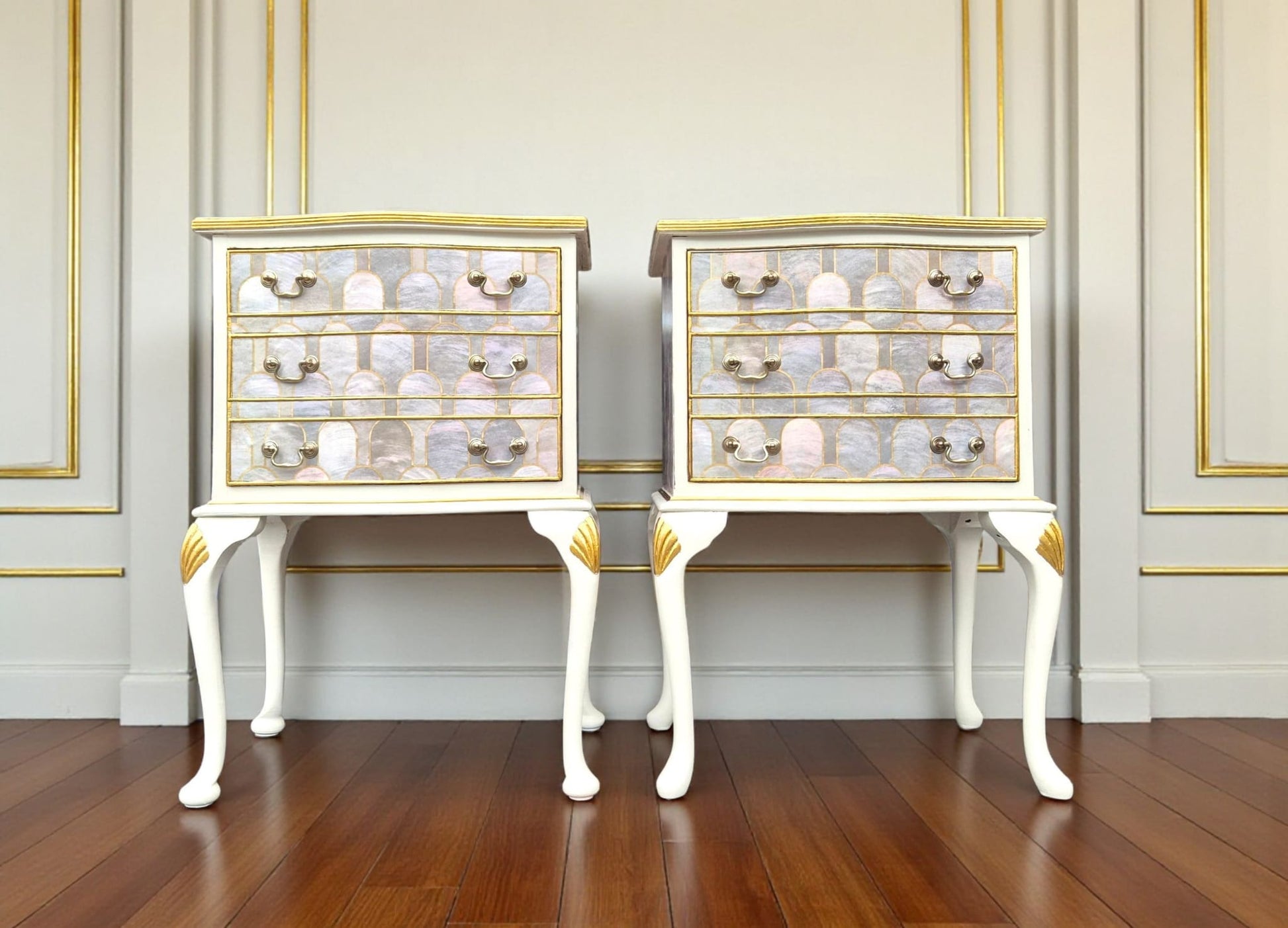 A stunning pair of bedsides which have been lovingly up-cycled in our studio. Each cabinet has one large drawer, the interior of which is lined with our signature gold crocodile skin paper. The cabinets have been decoupaged with striking Art Deco Nizwa paper by Bethan Gray in pearl. The paper has been treated with layers and layers of hardwearing wipe clean varnish for protection. We have added glass on top of both for extra protection. The tops and legs have been painted with hard wearing Frenchic Creme de la Creme with gold details throughout. Keeping your home free from the mass produced!