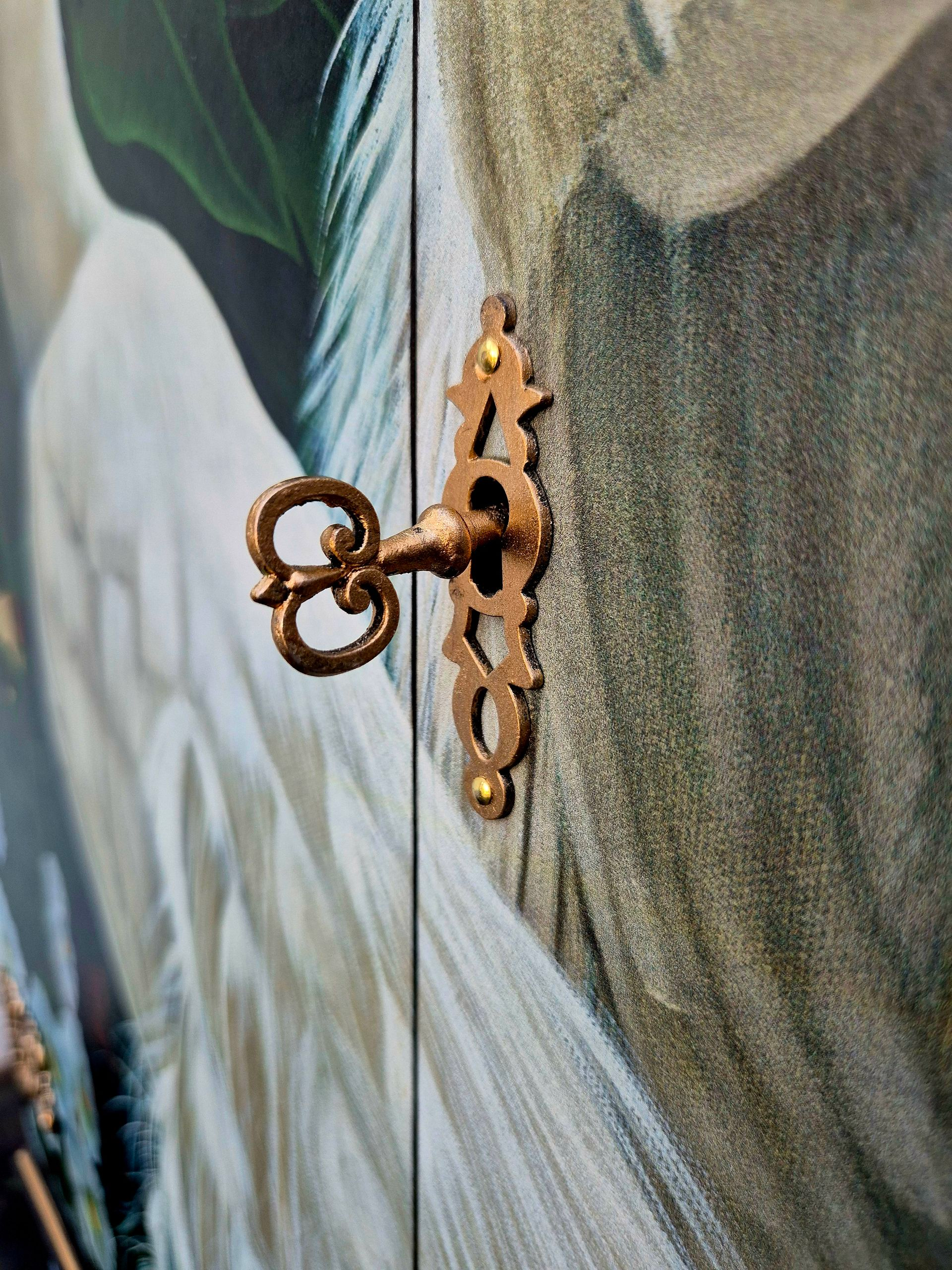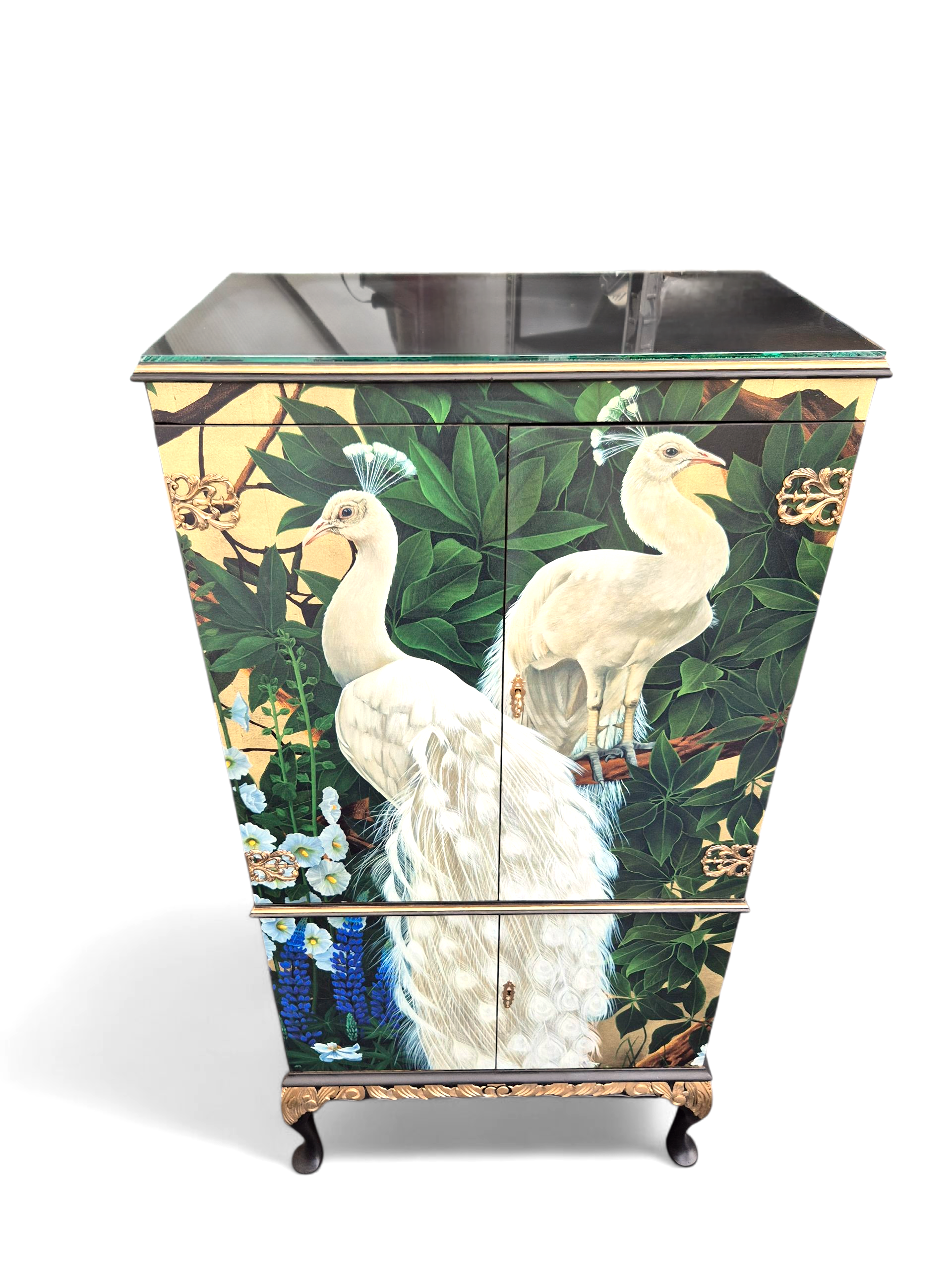 A stunning vintage cocktail cabinet which has been lovingly up-cycled in our studio. The cabinet is a beautiful and stylish piece with lots of storage. The interior has been spray painted in amazing gold. There is a mirror on the back and bottom. There are two glass shelves and one is curved. The bottom compartment has lots of lovely room for storage. The cabinet has been decoupaged with striking Chinoiserie artwork featuring two big beautiful peacocks on a golden background with beautiful trees and flowers. Ideal for creating a bold and immersive look whilst bringing an exotic and luxurious atmosphere to both contemporary and traditional interiors. The paper has been treated with layers and layers of hardwearing wipe clean varnish for protection. The rest of the cabinet has been spray painted in black and we have embellished the decorative details with gilded bronze finish infusing a touch of glamour and opulence to the piece. The cabinet has been fitted with a brand new light which will come on when you open the doors. We have added 6mm glass on top for extra protection. Keeping your home free from the mass produced.