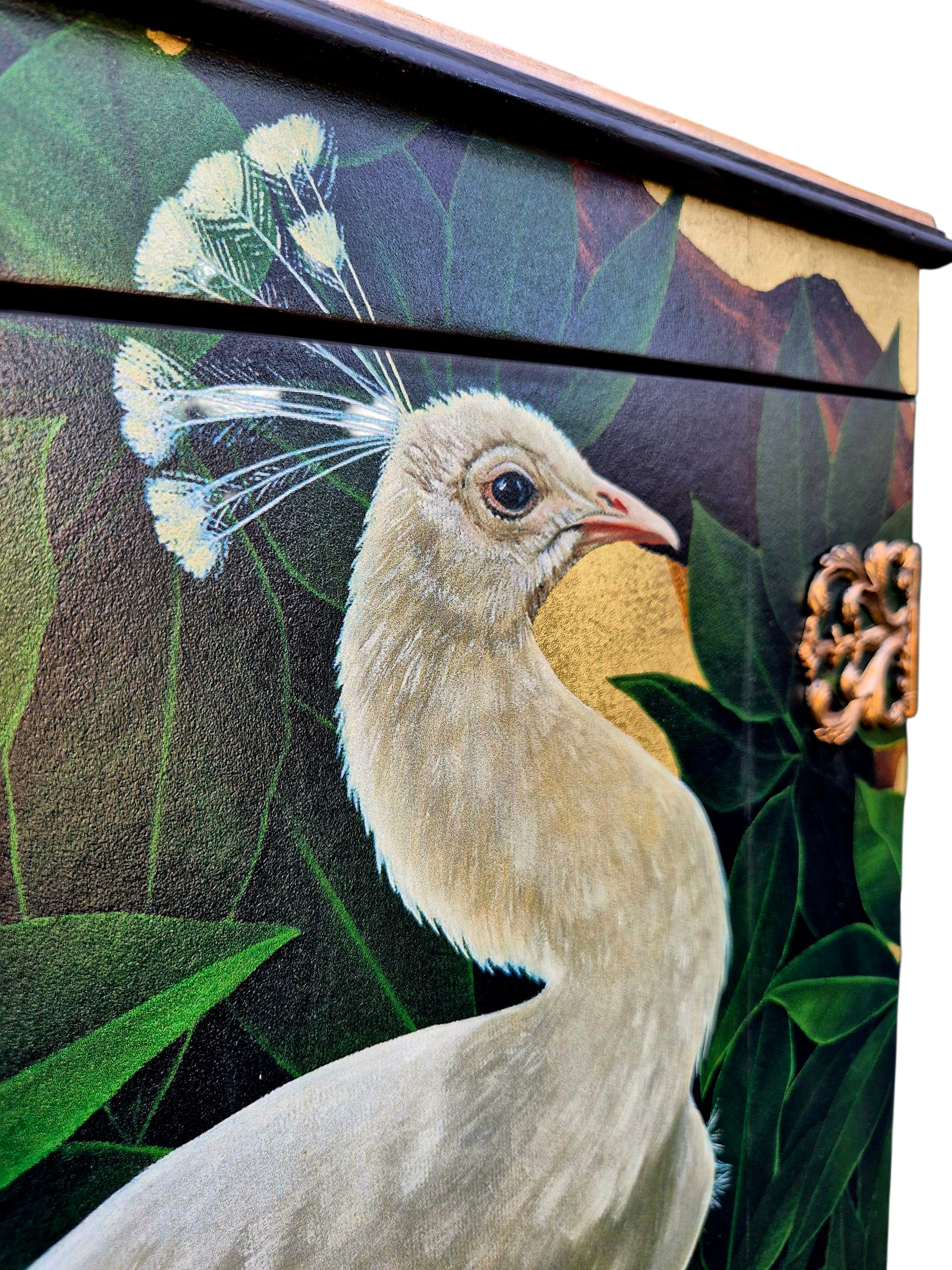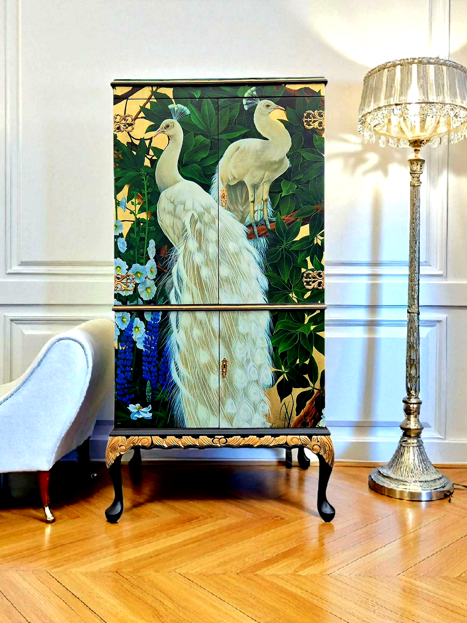Stunning Upcycled Vintage Cocktail Cabinet Gold Peacock with Chinoiserie Decoupage and Gold Interior