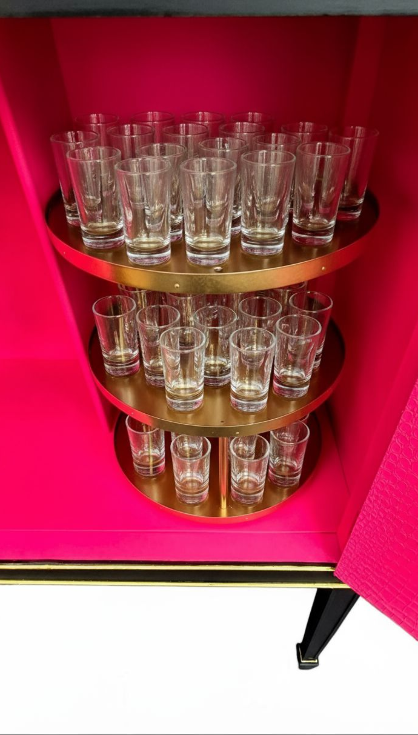 The drawer is lined in vibrant pink neon snakeskin, while the interior doors echo the same exotic texture for a truly cohesive finish. Inside, a striking three-tiered rotating gold shelf provides the perfect place to store shot glasses, jewellery, or makeup, adding both glamour and practicality. The lower compartment offers generous space for bottles and glassware if used as a cocktail cabinet — or for jewellery, makeup, or personal treasures if styled differently.