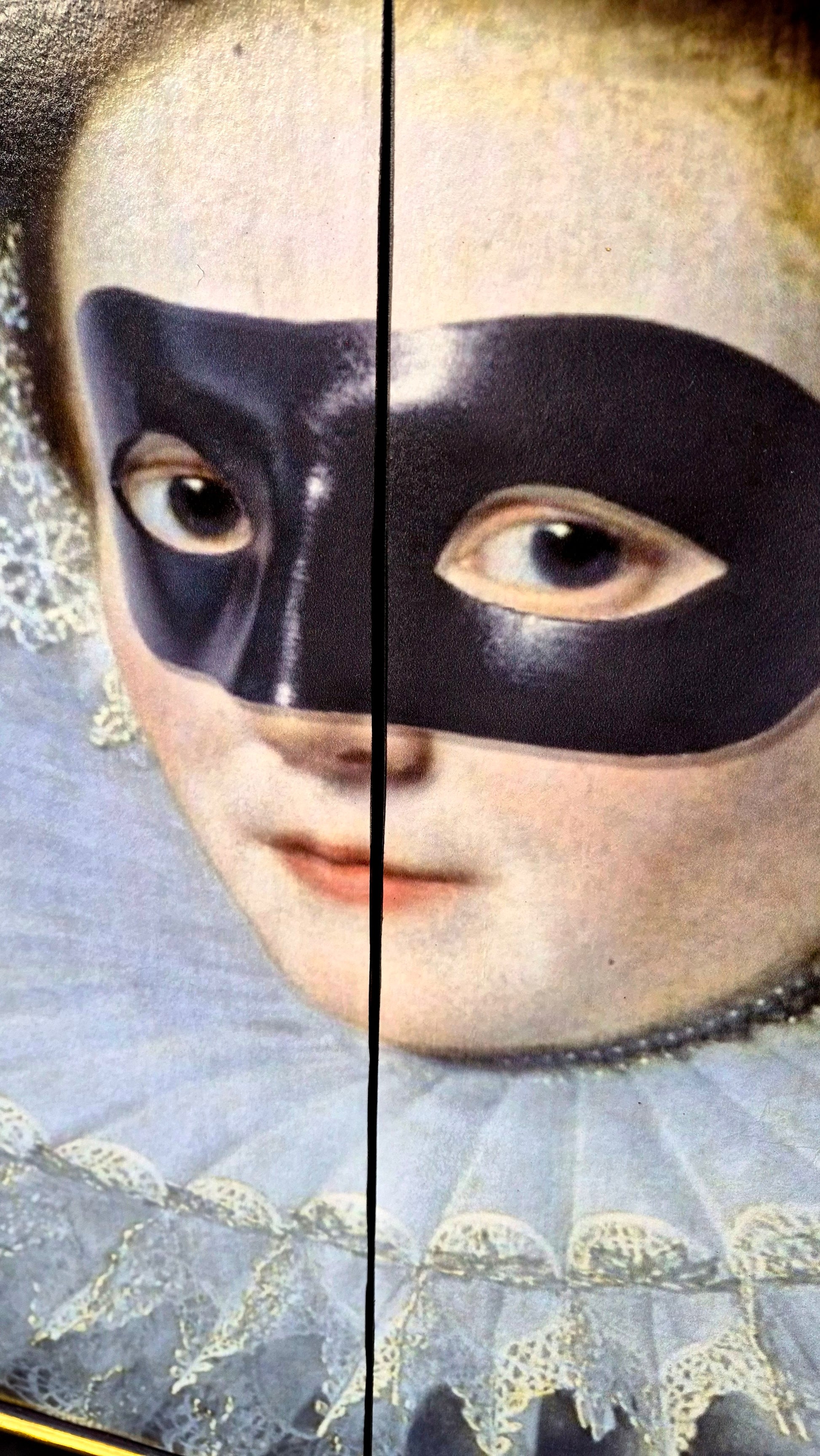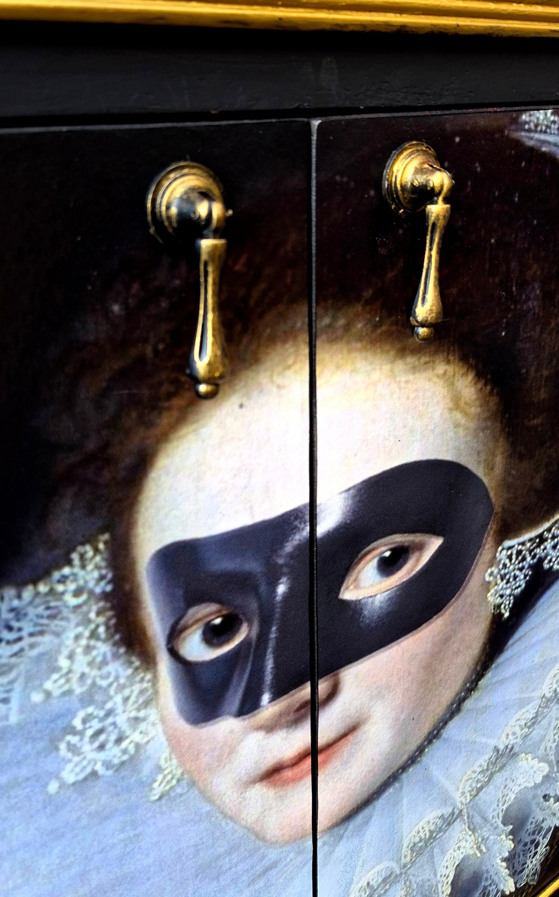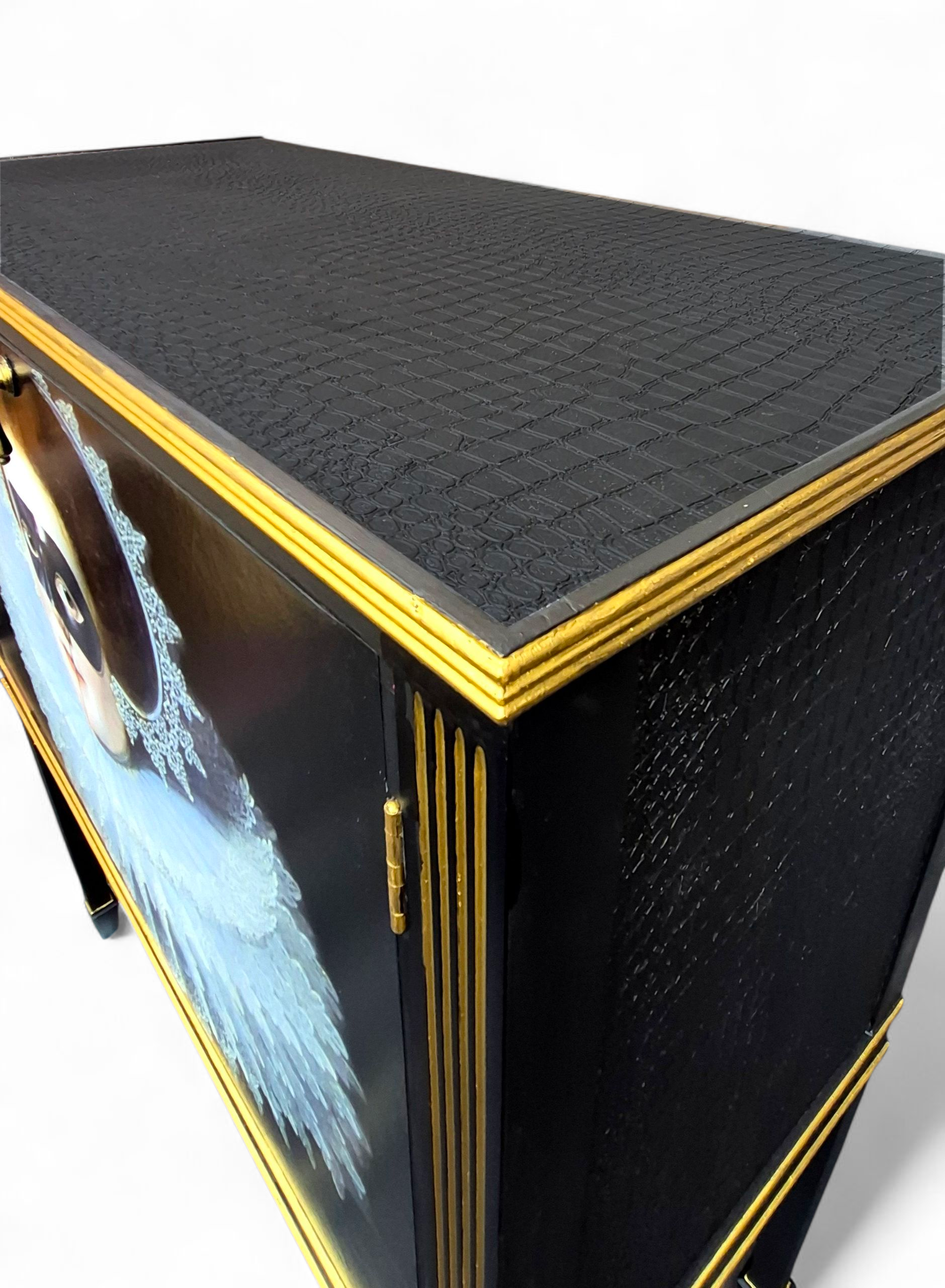 Externally, the cabinet is decoupaged with original “Masked Lady” artwork set against a rich black background — dramatic, glamorous, and utterly unique. The sides and top are finished in black snakeskin decoupage, complemented by a gilded gold trim for a touch of opulence.
